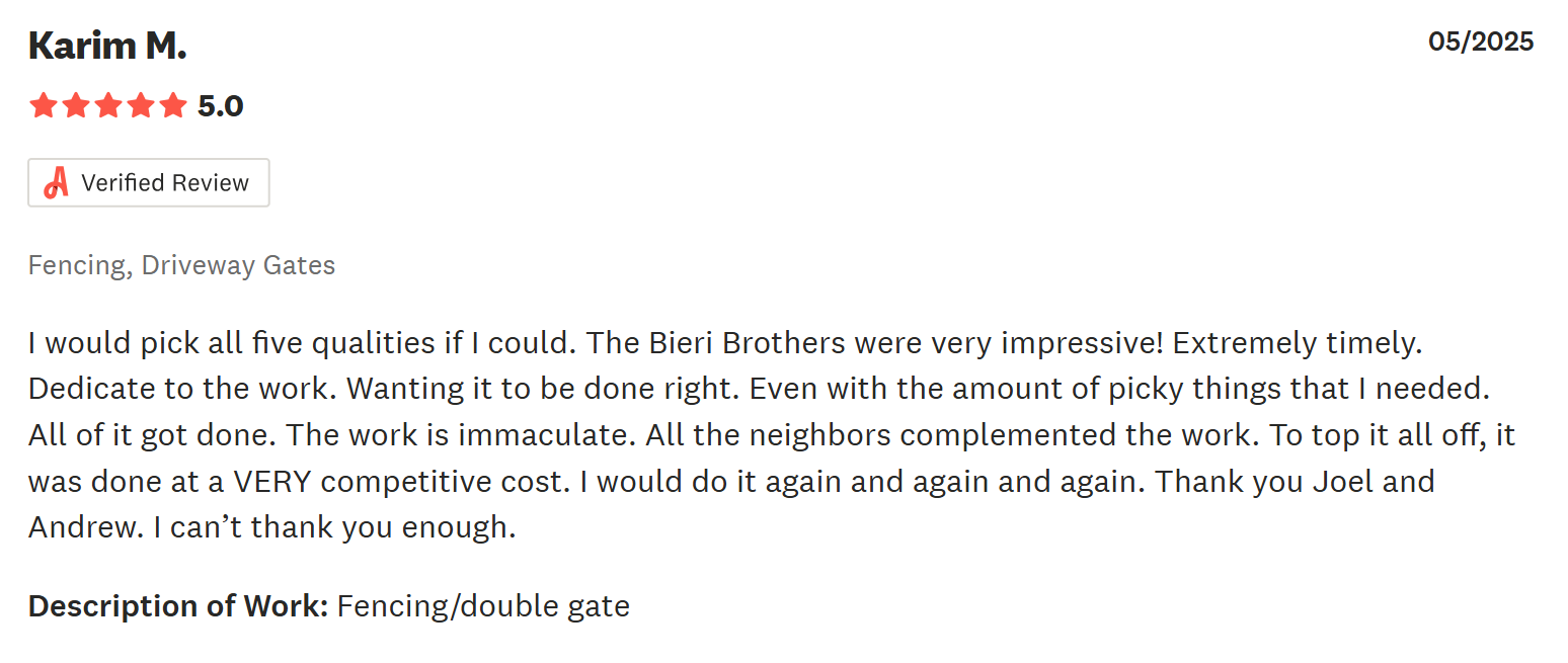 “Pricing was good. Workmanship and attention to detail, even better. They provided a driveway gate that four others never even suggested. They’re outstanding!” — Bill E.