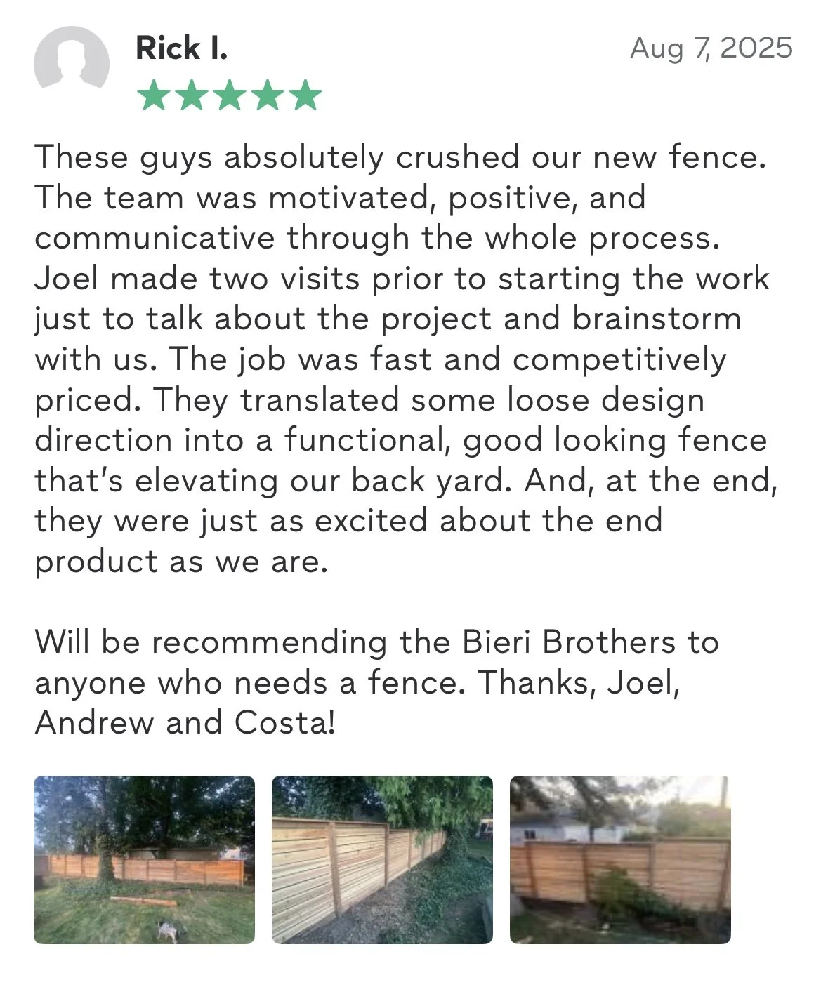 Joel and Andrew are especially passionate about custom projects — the ones that push creativity and deliver something beyond the standard. Their reputation comes from doing things the right way, even if it takes longer: inspecting every board, prioritizing quality at each step, and building fences that are made to last.